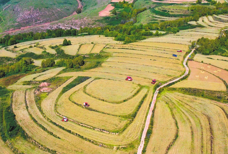 寧武縣頭馬營(yíng)村萬畝莜麥種植基地機(jī)械化收割場(chǎng)景。吳光宇攝