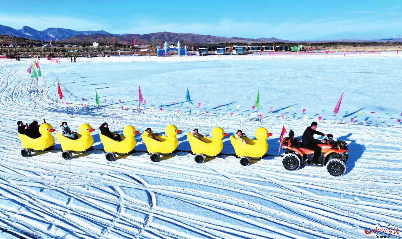 近日,寧武縣鴨子海冰雪大世界內(nèi)紅火熱鬧,一片歡樂景象。圖為冰面上,游客們盡情享受著冰雪項(xiàng)目帶來的樂趣。(