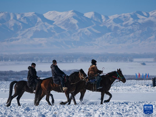 1月3日,在新疆昭蘇濕地公園,游客在當(dāng)?shù)啬撩瘢ㄓ遥ьI(lǐng)下體驗雪地騎馬。(新華社記者 胡虎虎 攝)