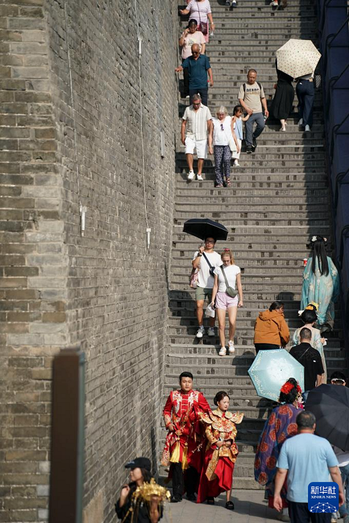 游客在西安城墻永寧門(mén)內(nèi)游覽,左側(cè)城墻上布設(shè)著城墻病害數(shù)據(jù)傳感監(jiān)測(cè)設(shè)備(2025年9月12日攝)。(新華社記者 邵瑞 攝)