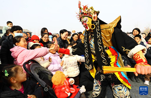 2月10日,在河南省周口市川匯區(qū)關(guān)帝廟廣場(chǎng),進(jìn)行表演的民間藝人與觀眾互動(dòng)。(新華社發(fā) 高建中 攝)