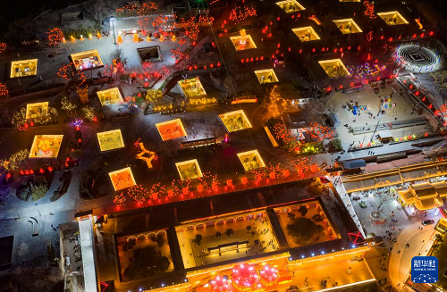 2月10日,人們?cè)诤幽鲜∪T峽市陜州區(qū)地坑院景區(qū)欣賞花燈(無人機(jī)照片)。(新華社發(fā) 孫猛 攝)