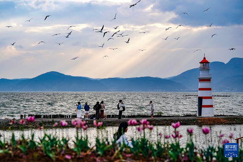 2月26日,游客在滇池邊一處拍照裝置拍照。(新華社記者 陳欣波 攝) 春日暖陽下,昆明滇池碧波蕩漾,遠(yuǎn)山如黛,紅嘴鷗翩躚起舞。游人沿岸漫步、駐足拍攝,共繪出一幅生動(dòng)宜人的春游畫卷。 (責(zé)任編輯:蔡文斌) |