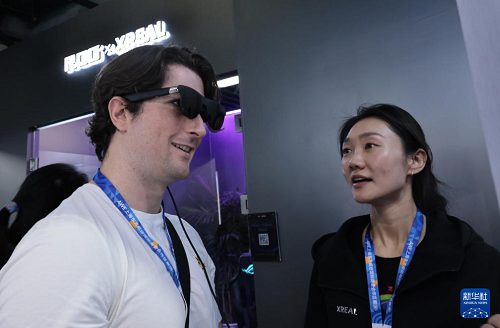 3月12日,參觀(guān)者(左)在東方樞紐展區(qū)現(xiàn)場(chǎng)體驗(yàn)一款智能眼鏡產(chǎn)品。(新華社記者 方喆 攝)