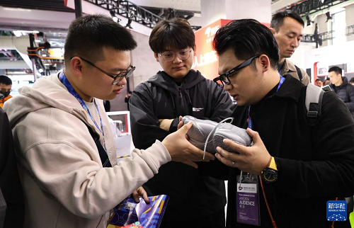 3月12日,參觀(guān)者在東方樞紐展區(qū)現(xiàn)場(chǎng)查看一只由熱塑性聚氨酯彈性體TPU材質(zhì)3D打印的可穿運(yùn)動(dòng)鞋。(新華社記者 方喆 攝)