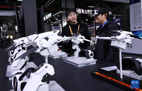 3月12日,參觀(guān)者(右)在東方樞紐展區(qū)現(xiàn)場(chǎng)佩戴智能眼罩體驗(yàn)全景飛行器視角。(新華社記者 方喆 攝)