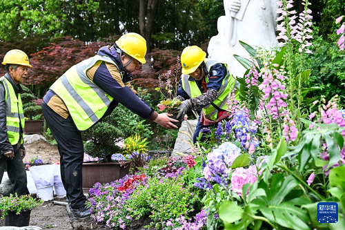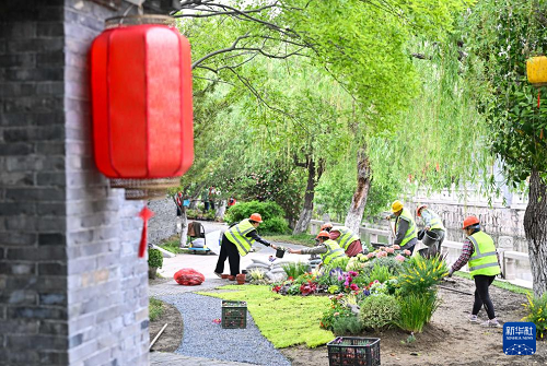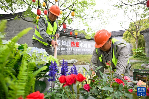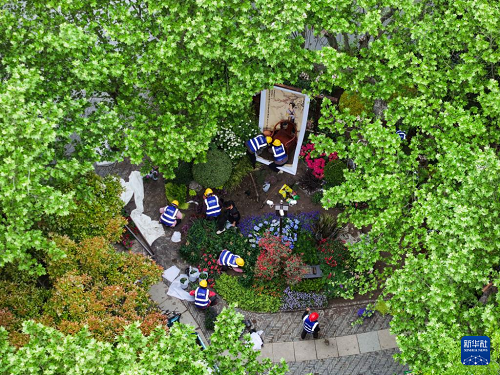 4月28日,參賽隊(duì)伍在如皋水繪園風(fēng)景區(qū)營(yíng)造花境作品。(新華社記者 季春鵬 攝)