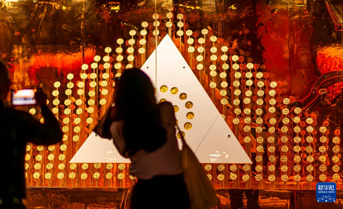 觀眾在拍攝?;韬钅钩鐾恋?85枚餅形金(4月29日攝)。(新華社記者 魏培全 攝)