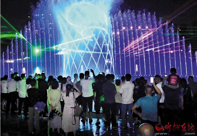 公園在注重園林、景觀建設(shè)的同時(shí),突出主題文化內(nèi)涵的展現(xiàn),湖水噴泉、觀賞果園、主題植物園、階梯花臺(tái)等特色園林具有觀賞性,園內(nèi)還配套建有遺山文化館、張拉膜廣場、健舞劇場、休閑茶吧、咖啡館等群眾休閑活動(dòng)場所,是又一惠及民生的心靈家園。圖為8月1日晚,市民在遺山公園噴泉廣場觀賞絢麗多彩的噴泉燈光秀。劉紀(jì)森 智芝龍 白曉明 胡 煒 攝