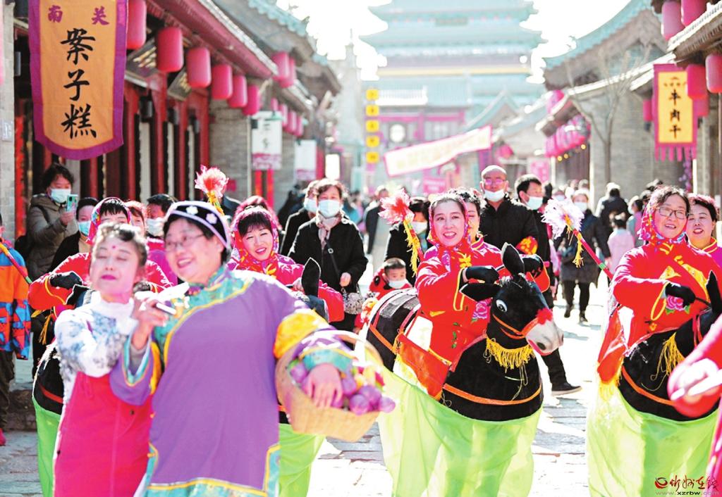 2月17日,忻州古城,民間文藝表演隊(duì)正在街頭巡演。春節(jié)期間,忻州古城舉辦“逛古城、品文化、識忻州”旅游文化活動,雄獅起舞、八音吹奏、秧歌表演等一系列富有當(dāng)?shù)靥厣拿耖g文藝活動精彩紛呈,吸引了眾多旅游者游覽觀賞,整個古城呈現(xiàn)出一派喜慶祥和的節(jié)日氣氛。 (李兆民 攝)