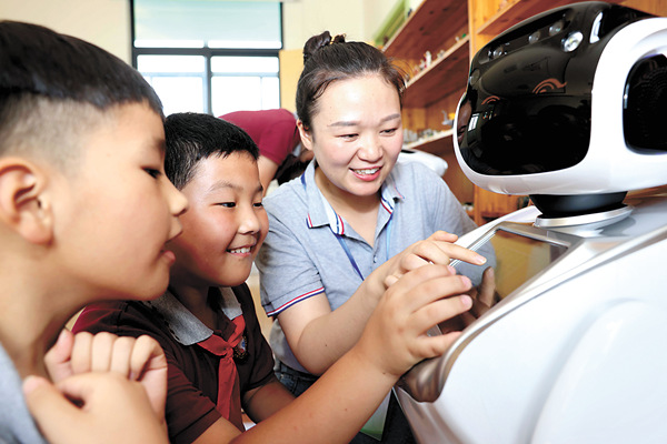 為緩解未成年人假期“看護(hù)難”問題,安徽省合肥市瑤海區(qū)試點(diǎn)免費(fèi)提供音體美興趣培養(yǎng)、公益看護(hù)、讀書賞析、作業(yè)輔導(dǎo)、科技創(chuàng)新等為主要內(nèi)容的“五彩假日”托管和教育服務(wù)。圖為孩子們?cè)诤蜋C(jī)器人做互動(dòng)游戲。 新華社發(fā)(解琛 攝)