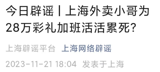 11月20日,上海網(wǎng)絡(luò)辟謠微信官方賬號(hào)發(fā)布辟謠文章。針對(duì)近日網(wǎng)傳“為掙28萬(wàn)彩禮娶媳婦,上海外賣(mài)小哥活活累死”一事,經(jīng)過(guò)核查發(fā)現(xiàn),事件純屬自媒體捏造散布。