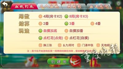 進入游戲后,界面顯示“創(chuàng)建房間”和“加入房間”兩項。玩家創(chuàng)建房間時,可選擇局數(shù)、玩法等具體設置,還能選“自摸加底”“自摸加番”“點杠花(點炮)”“點杠花(自摸)”“換三張”等,然后通過微信邀請好友加入牌局。接到邀請的玩家,輸入房間號后就能進入牌局,通過手機聯(lián)網(wǎng)打麻將。