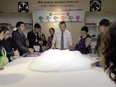 下午2點半,按照行程,旅行團(tuán)將參觀蜀繡,旅行團(tuán)被帶往一家門口寫有“蜀繡蜀錦科技文化展示中心”字樣的單位,但這家單位實際上是名為“依格爾”的床上用品直銷工廠。講解員簡單講解了有關(guān)蜀繡蜀錦的知識后,就把游客帶往一個展覽廳,向游客推介他們工廠的蠶絲床上用品,價格從3980到6980元不等。