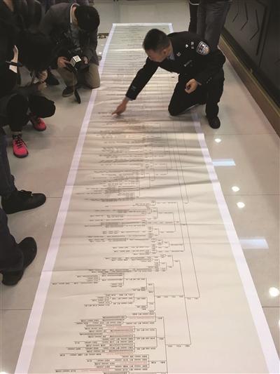 當(dāng)時公安信息化不是很發(fā)達,家譜上的姓名和公安機關(guān)戶籍系統(tǒng)中的姓名有出入。民警將上千名家譜中的男性逐一翻拍,回南京后再根據(jù)翻拍的家譜照片,按照每一個人的血緣、親緣、家庭關(guān)系,逐人核對、逐人梳理。由于當(dāng)?shù)丶易宄蓡T關(guān)系非常復(fù)雜,民警足足耗時兩個多月,制作出了一份長達6.8米的家譜關(guān)系圖。