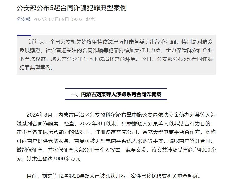 2024年8月,內(nèi)蒙古自治區(qū)興安盟科爾沁右翼中旗公安局依法立案偵辦劉某等人涉嫌系列合同詐騙案。經(jīng)查,2022年8月以來,犯罪嫌疑人劉某等人以非法占有為目的,在不具備實際運營能力的情況下,注冊多家空殼公司,冒充大型電商平臺合作方,虛構(gòu)可向商戶提供倉儲服務(wù)、商品可被大型電商平臺優(yōu)先采購等事實,騙取商戶簽訂合同、繳納保證金,并將保證金大部分用于個人揮霍。截至案發(fā),該案共涉及受害商戶4000余家,涉案金額達7000余萬元。