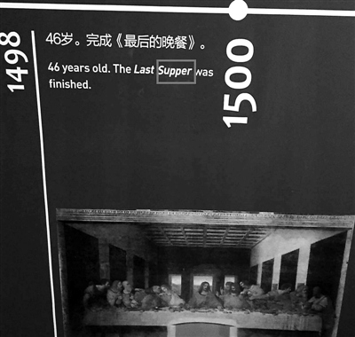 該網(wǎng)友發(fā)現(xiàn),在這個介紹達·芬奇生平的年表上,英文錯誤不止一處:關(guān)于達·芬奇46歲的經(jīng)歷,展覽介紹說:“46歲。完成《最后的晚餐》”,其對應(yīng)的英文翻譯是“46 years old. The Last super was finished.”而super一詞在英文中的意思是“超級的”,“晚餐”的英文詞匯實為supper,該翻譯中少了一個字母“p”。