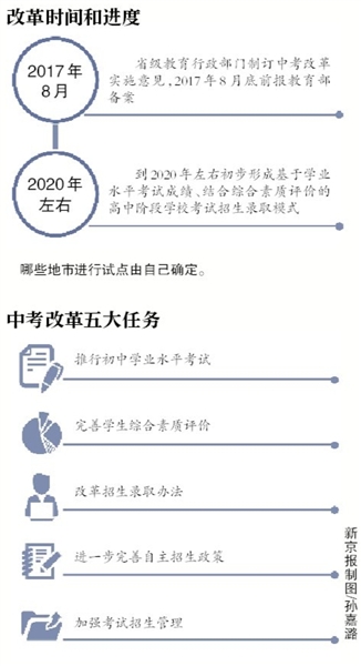 根據(jù)安排,省級教育行政部門負責制訂中考改革實施意見,并于2017年8月底前報教育部備案。同時,綜合改革試點將從2017年之后入學的初中一年級學生開始實施,目前初中在校生、非試點地市仍執(zhí)行原來的考試招生辦法。