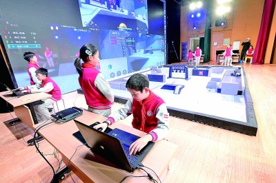 北京市海淀區(qū)實驗小學(xué)的學(xué)生在操控機(jī)甲機(jī)器人進(jìn)行對抗比賽。新華社發(fā)