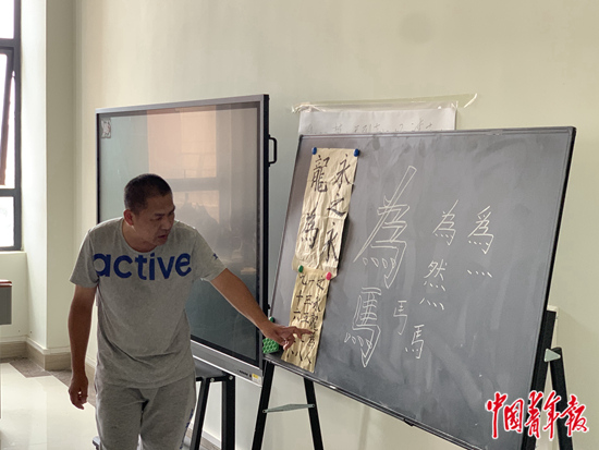 蔡偉在書法課上指導(dǎo)學(xué)生。