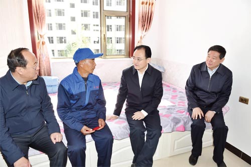 圖為市委書(shū)記李俊明在岢嵐縣城扶貧移民集中安置點(diǎn)回訪貧困戶曹六仁。馮曉磊 攝