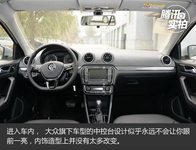 進(jìn)入車內(nèi), 大眾旗下車型的中控臺設(shè)計(jì)似乎永遠(yuǎn)不會讓你眼前一亮,內(nèi)飾造型上并沒有太多改變。全新三輻平底方向盤是最大改變,盤輻大小正好,握感也很不錯,鋼琴烤漆的飾條更是點(diǎn)睛之筆,兩側(cè)多功能按鍵可以控制多媒體和藍(lán)牙電話等功能。儀表盤的底紋有所改變,黑底白字清晰易讀,中央是單色行車電腦顯示屏。車內(nèi)空調(diào)出風(fēng)口造型有所調(diào)整,內(nèi)部構(gòu)造更加復(fù)雜。