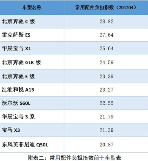 猜你還想看這些: 最新資訊,嫩模酒駕撞三人,開車發(fā)短信13死,女司機下車后被自己車撞》》》》 新車消息,5月新車,沃爾沃XC40假想圖,保時捷911特別版》》》》 常用配件負(fù)擔(dān)指數(shù)方面,在汽車零整比系數(shù)基礎(chǔ)上,挖掘事故車維修數(shù)據(jù),選取配件損失率大于 1%的常用配件進行研究,導(dǎo)入計算公式核算各車型的常用配件負(fù)擔(dān)指數(shù)。在樣本車型中最高的車型為北京奔馳 C級,常用配件負(fù)擔(dān)指數(shù)為 28.82;最低的車型為哈弗 H6,常用配件負(fù)擔(dān)指數(shù)為 9.32。