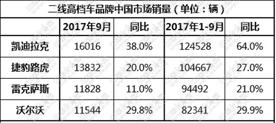 相比上月,9月的二線高檔車市似乎漲勢(shì)更甚。凱迪拉克、捷豹路虎、雷克薩斯、沃爾沃四家品牌9月銷量均超萬輛,9月及前9月同比漲幅均超2位數(shù)。整體漲勢(shì)之下,二線高檔車市的排名趨勢(shì)愈發(fā)穩(wěn)定、清晰。然而,伴隨“神鋼”造假事件的不斷發(fā)酵,也為這一市場(chǎng)增添一大變數(shù)。