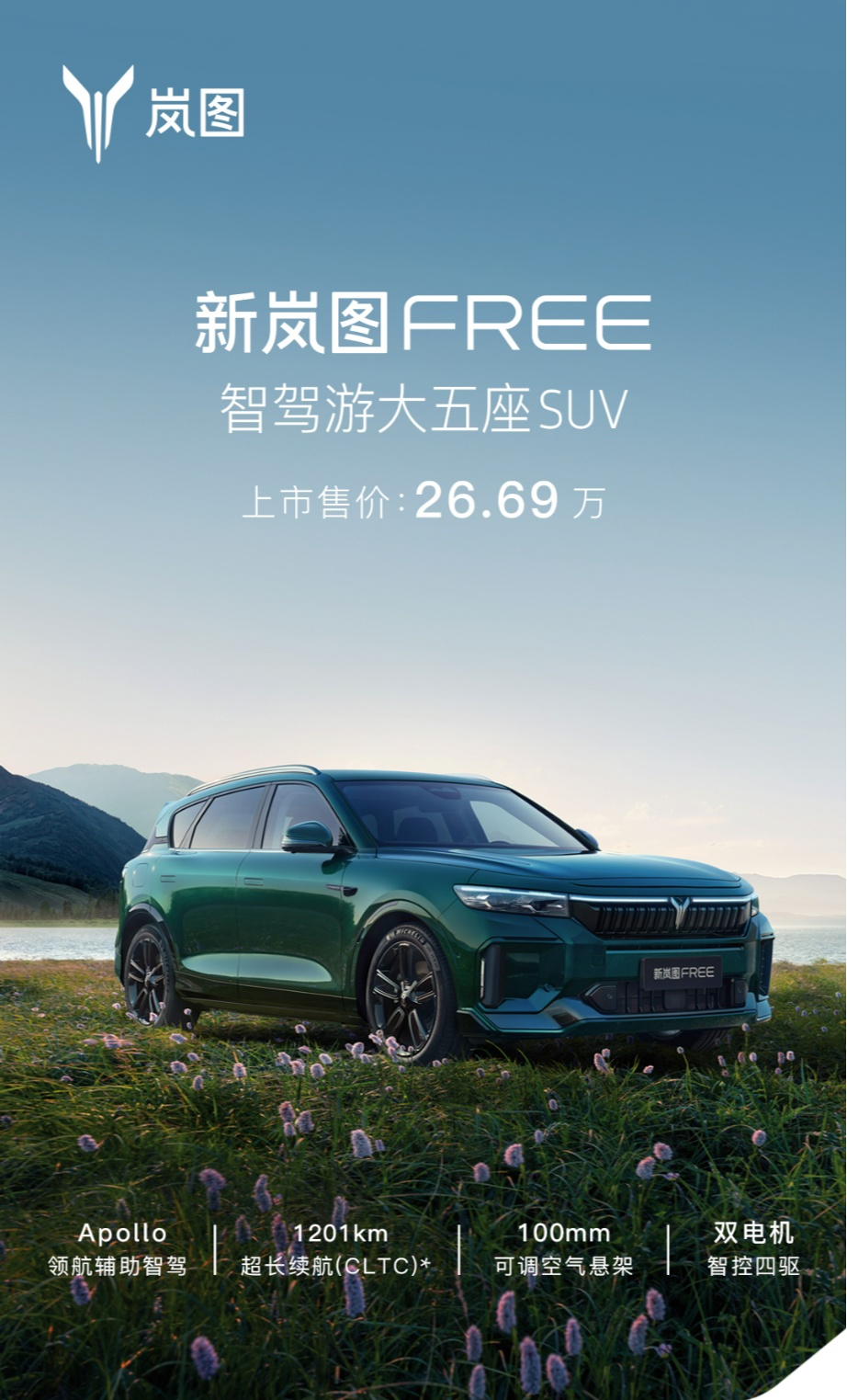 (廠商供圖 央廣網(wǎng)發(fā)) 嵐圖汽車CEO盧放表示,作為“智駕游大五座SUV”,新嵐圖FREE的“智”,代表Apollo Highway Driving Pro領(lǐng)航輔助智駕帶來的智駕體驗;“駕”,意味著繼承了嵐圖品牌基因里的駕控實力;“游”,則是超長續(xù)航、超低能耗以及豪華配置帶來的舒適享受。新嵐圖FREE有智慧、有力量、有激情,專為追求自由的“公路旅行家”打造,嵐圖期待與廣大用戶一起,盡情釋放心中的自由,奔赴遠方,開啟人生的“智駕游”。 百度Apollo領(lǐng)航輔助智駕賦能,新嵐圖FREE殺入智駕第一梯隊 新嵐圖FREE搭載了百度Apollo Highway Driving Pro領(lǐng)航輔助智駕,能為用戶帶來行泊一體、點到點的高階智能駕駛體驗。該智駕系統(tǒng)具備領(lǐng)航輔助智駕功能(NOA)和人機共駕地圖,超過6000萬公里測試驗證確保安全可靠。 在高速場景下,新嵐圖FREE的領(lǐng)航輔助智駕可實現(xiàn)高效變道、自動識別進出匝道、大車避讓以及全球首個智能進出服務(wù)區(qū)輔助功能,自主變道成功率大于99%,平均百公里接管次數(shù)小于1次,進出匝道場景成功率大于95%,單次出行相對人駕平均省時7%。在城區(qū)擁堵路況下,新車的自適應(yīng)巡航能實現(xiàn)自動加減速、智慧跟車,還可實現(xiàn)撥轉(zhuǎn)向燈后自動變道,并通過提前感知路況信息,實時幫車輛選擇最優(yōu)路線。 泊車方面,新嵐圖FREE支持全姿態(tài)高效自動泊車、一鍵遙控泊車、記憶泊車以及遠程召喚等多種精準智能泊車功能,解決用戶日常出行中停車難、停車煩、找車難等各種泊車難題。 延續(xù)嵐圖駕控基因,打造最好開的新能源SUV 在性能上,新嵐圖FREE繼承了嵐圖品牌的駕控基因,采用前160kW后200kW雙永磁同步電機,整車最大功率可達360kW,峰值扭矩720N·m,零百加速最快可達4.8s,擁有媲美超跑的強悍性能,讓用戶勁享高速行駛中的激情和快感。 在操控性上,新嵐圖FREE采用動態(tài)智控電四驅(qū),配備前雙叉臂后多連桿運動獨立懸掛以及全鋁合金底盤,相比鋼制底盤輕30%,帶來更好的操控平順性與燃油經(jīng)濟性,而且永不銹蝕、耐久可靠。此外,采用的高性能空氣懸架支持上下100mm高度調(diào)節(jié),配備毫秒級隨速可調(diào)系統(tǒng),匹配經(jīng)濟、舒適、高能、郊游、自定義五種駕駛模式,讓用戶從容應(yīng)對出游時的各種復(fù)雜路況。