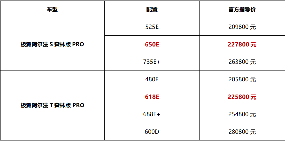 1月25日,極狐汽車旗下阿爾法S/T森林版PRO整體在原森林版基礎上,圍繞前后排座椅加熱/按摩、真皮方向盤、熱泵空調(diào)等豪華、舒適性配置進行多維升級,同時還新增了阿爾法S森林版PRO 650E、阿爾法T森林版PRO 618E,官方指導價分別為22.78萬元、22.58萬元。