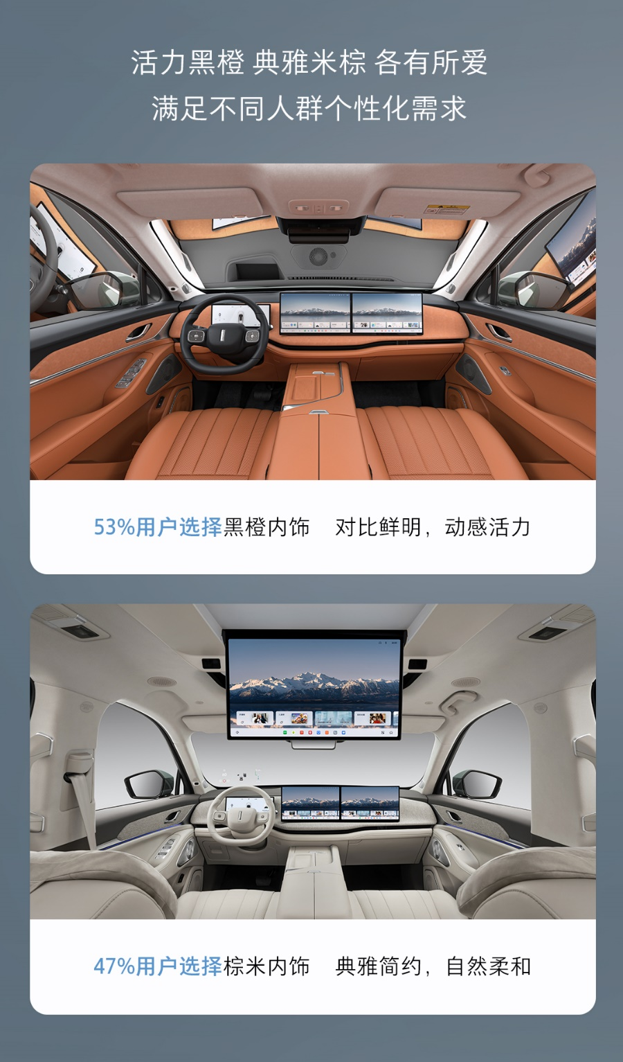 在內(nèi)飾方面,黑橙搭配占比53%,既保留了黑色的神秘感,又融入了橙色的活力元素,整體風(fēng)格不失優(yōu)雅大氣,又充滿動(dòng)感與生機(jī),彰顯出對比鮮明、溫暖陽光的空間氛圍;棕米內(nèi)飾則以47%的占比,為車艙營造一抹精致與高雅,高級(jí)質(zhì)感,一眼望去平和寧靜,營造出自然柔和的家庭氛圍,同樣符合更多用戶的審美需求。
