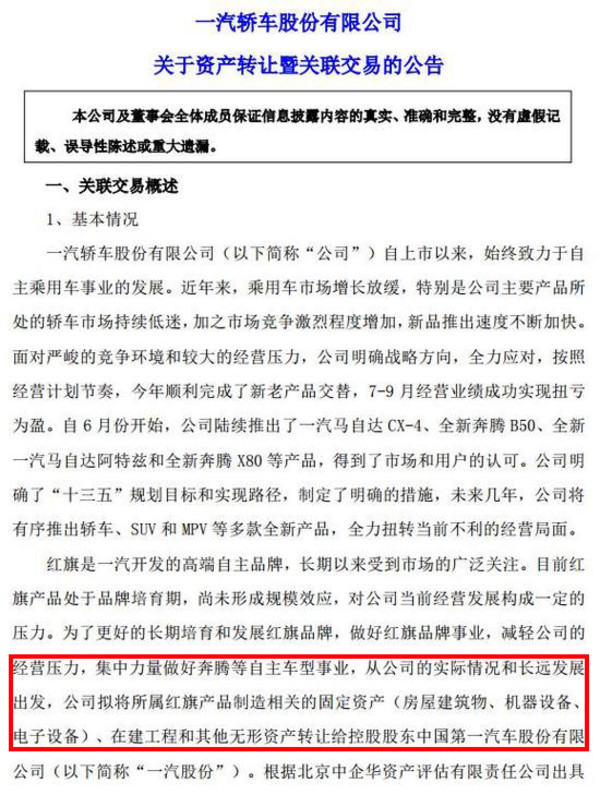 根據(jù)此前公告,一汽轎車根據(jù)資產(chǎn)評(píng)估的結(jié)果,在和一汽集團(tuán)協(xié)商一致的前提下,將評(píng)估價(jià)值為3.7億元的紅旗旗下資產(chǎn),以含增值稅人民幣 4.2億元的交易價(jià)格轉(zhuǎn)讓給一汽股份,并且表示, 本次資產(chǎn)轉(zhuǎn)讓的關(guān)聯(lián)交易已經(jīng)在第七屆董事會(huì)第七次會(huì)議中審議通過(guò),在交易合同簽署生效后20天內(nèi)一汽股份需要向一汽轎車支付轉(zhuǎn)讓資產(chǎn)價(jià)款。這意味著,紅旗品牌已歸屬于一汽股份所有,從一汽轎車中獨(dú)立出來(lái)。(圖/文 網(wǎng)通社 陳旭明)