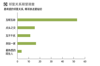 除了以上硬件設(shè)施環(huán)境,鄰里關(guān)系這樣的軟性條件也極大影響人們居住質(zhì)量。和“年輕人不愛社交”這樣的普遍認(rèn)知不同,調(diào)研發(fā)現(xiàn)53%受訪者期待互幫互助的鄰里關(guān)系,更有16.5%的人希望和鄰居親如一家。“遠(yuǎn)親不如近鄰”,在當(dāng)下依然沒有過時。