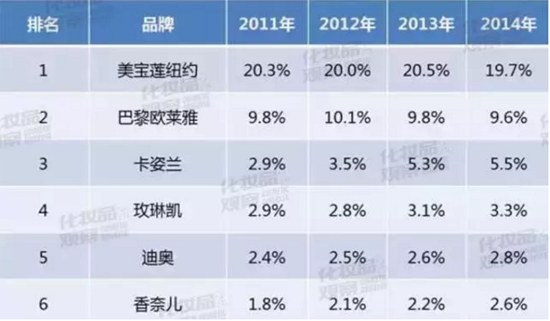 2014年,美寶蓮在中國的零售額到達(dá)了40億人民幣,而且以遠(yuǎn)超其他品牌的市場占有率穩(wěn)居中國彩妝市場第一位的位置。但隨著國內(nèi)本土彩妝的興起及現(xiàn)有彩妝市場的飽和,美寶蓮在經(jīng)歷野蠻生長期后增長速度開始放緩。