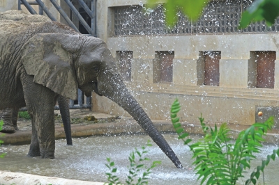 在大象展區(qū),寬敞的運動場地上,淋浴噴頭頗為顯眼,下方還有一個半米多深的水池,天氣熱的時候,大象可以邊淋浴邊戲水,時不時甩開長鼻子吸起水來為自己沖涼。運動場上還有兩個七八米高的草棚,沖完涼的大象可以躺在下面乘涼休息。