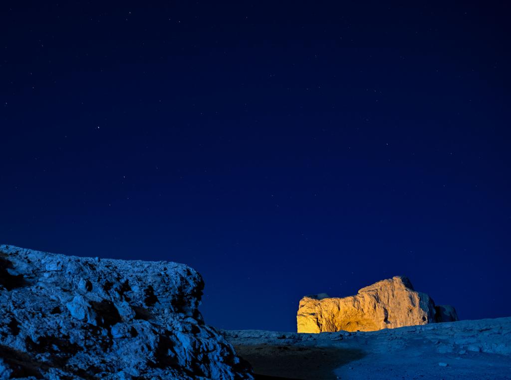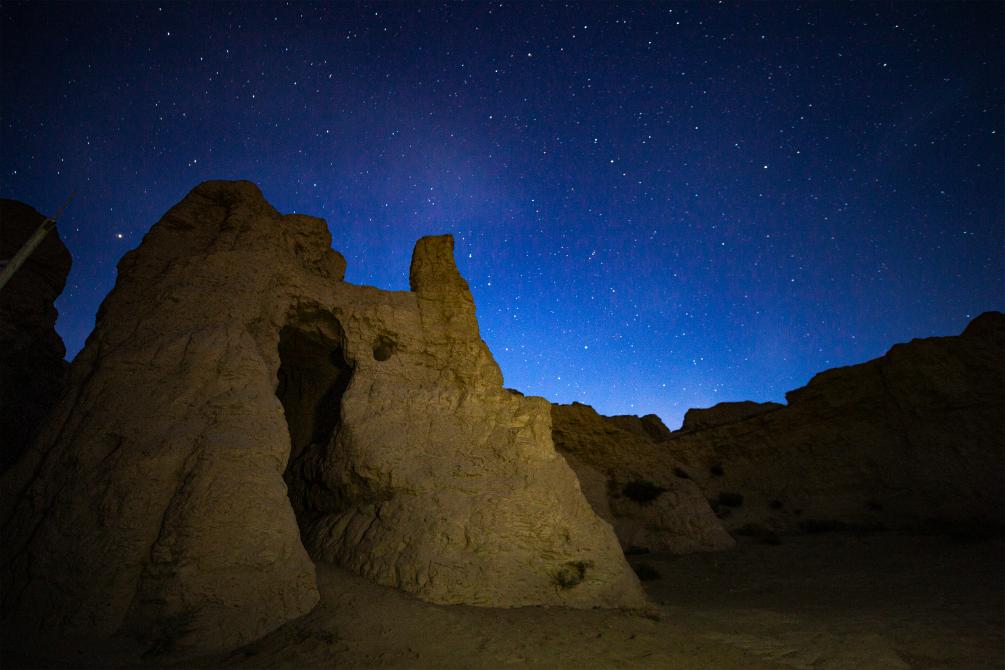 這是8月18日夜拍攝的交河故城。新華社記者 陳朔 攝 “人們常說,萬丈高樓平地起,但這座建在近30米高臺(tái)地上的故城不同,它是一座向地下掏挖出來的城市,猶如一件巨大的生土雕刻藝術(shù)品。”講解員古麗尼格·克力木說,古人在地面事先規(guī)劃好建筑物的布局,確定了墻壁位置后,把墻內(nèi)外的土挖去,等豎好墻,再挖出房間。 吐魯番市文物局交河故城文管所所長(zhǎng)王建東介紹,這種“壓地起凸法”與陜甘寧等地傳統(tǒng)的窯洞開鑿方式有一定關(guān)聯(lián),豐富的建筑技法展現(xiàn)了古代西域與中原地區(qū)建筑技藝和城市文化的交流。 夕陽余暉中,一片片斷壁殘?jiān)橙胙酆煟老∧軌蛳胂蟮?,現(xiàn)在被譽(yù)為“世界上最完美的廢墟”的交河故城,當(dāng)年房屋鱗次櫛比、街市熙攘的場(chǎng)景。