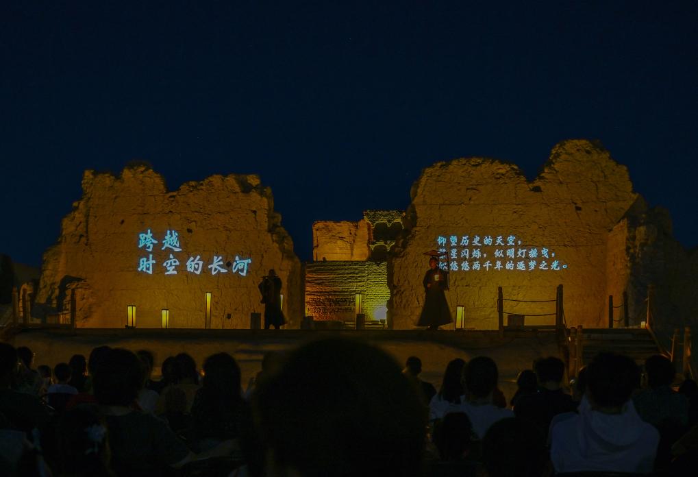夜幕下的交河故城。(吐魯番市文物局交河故城文管所供圖) 這座城,東漢名將班超來過,唐玄奘西去求取真經(jīng)時(shí)路過,多少漢唐邊塞詩人走過……月色下,故城輪廓冷冽清晰,南北向兩條大道將居民區(qū)、寺院區(qū)、倉儲(chǔ)區(qū)分為兩側(cè),建筑形制與唐代長(zhǎng)安城相仿,城市中部是官署區(qū),也是交河故城最高的地方。站在官署區(qū)高處,溫?zé)岬娘L(fēng)裹挾著砂礫,吹過身側(cè),游人好似跨越時(shí)空…… 夜游交河行至一半,影影綽綽的燈光,照亮通往大佛寺的路?!督缓又埂访褡逡魳窌?huì)實(shí)景演出開始上演。 深藍(lán)色夜幕下,兩排戶外燈照亮高大殘舊的城墻。身著僧侶服飾的演員雙手合十、懷抱經(jīng)卷,從夜色中走來。時(shí)鐘隨著他的朗誦,仿佛回轉(zhuǎn)到佛教鼎盛期的唐代西域。在舞臺(tái)前方席地而坐的游客,看得如醉如癡。 一人獨(dú)奏或三人合唱,音樂會(huì)上,長(zhǎng)笛聲與少數(shù)民族樂器熱瓦普、薩塔爾的樂聲在夜空下交織,文化交流融合之美如同繁星般閃爍。 “這是十二木卡姆的選段,”游客木尼熱聽到熟悉的旋律,眼眶泛紅,“兼具藝術(shù)性、民族性的曲目,與故城的歷史與景致相得益彰,實(shí)在不虛此行?!?/p>