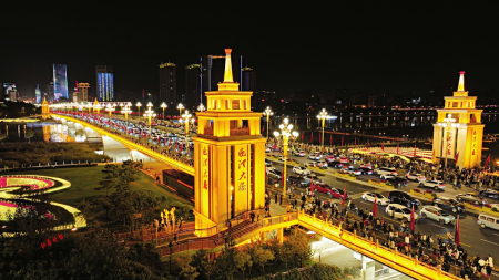 夜幕下新近改造的迎澤大橋宛如一條被紅色點(diǎn)亮的巨龍,橫臥在波光粼粼的汾河之上。金色的欄桿、飄動(dòng)的五星紅旗、耀眼的中華燈裝扮出濃濃的節(jié)日氛圍,從四面八方趕來的人們漫步橋上,頻頻舉起手機(jī)拍照留念。