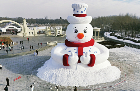 12月8日,哈爾濱今冬第一個(gè)大雪人“雪人先生”在太陽(yáng)島風(fēng)景區(qū)落成。大雪人高20米,用雪量4000立方米。圖為12月9日在哈爾濱太陽(yáng)島風(fēng)景區(qū)正門(mén)廣場(chǎng)拍攝的大雪人(無(wú)人機(jī)照片)。