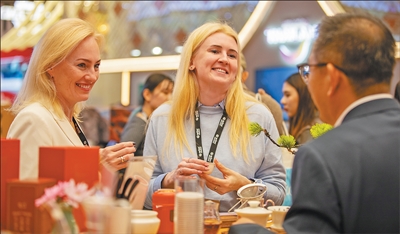 在中國展區(qū),兩名英國參展商一邊品茶,一邊與中國旅游企業(yè)代表交流。本報(bào)記者 許立群攝