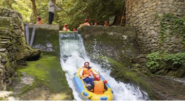 2026年4月25日,位于廣西桂林市陽朔縣興坪鎮(zhèn)的龍頸河景區(qū),游客正在體驗驚險刺激的漂流。黃勝林?jǐn)z(人民圖片網(wǎng))