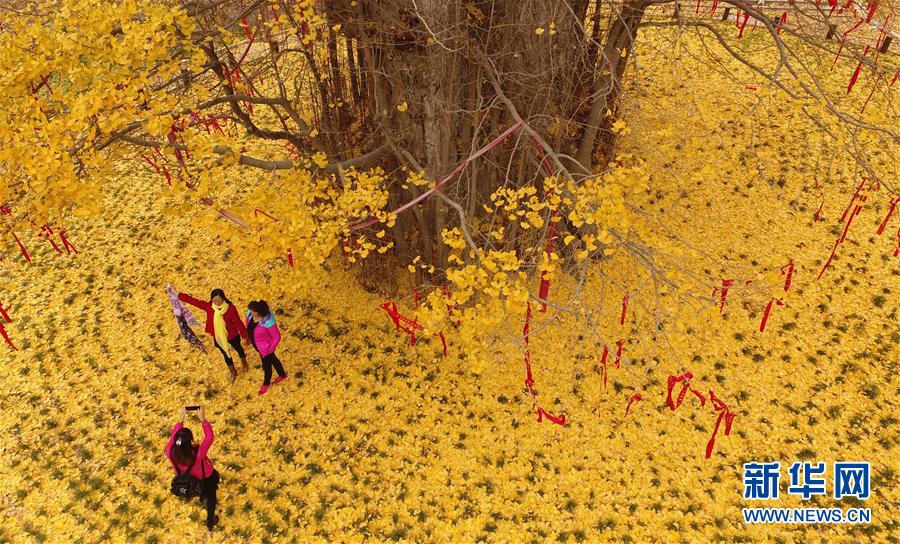 11月19日,游客在留壩縣玉皇廟鎮(zhèn)參觀千年銀杏樹。初冬時節(jié),在秦嶺深處的陜西省留壩縣玉皇廟鎮(zhèn)石窯壩村,一棵千年古銀杏樹的落葉宛如金色地毯,甚為壯觀。據(jù)當(dāng)?shù)亓謽I(yè)部門介紹,該樹胸徑為4.45米,現(xiàn)有高度29米。新華社記者 陶明 攝
