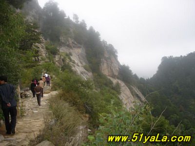 北武當(dāng)山主峰四周幾乎都是陡壁懸崖,只有一條人造“天梯”可攀。來(lái)到山腳下,過(guò)五里黃土、五里沙路,便是1400余級(jí)就山鑿筑的石階,凡險(xiǎn)峻之處,設(shè)有鐵索扶手。石階一線疊置,從下仰視,宛如“天梯”。游人攀登,每一步都可聽(tīng)到悠揚(yáng)頓挫的“石音”,形成獨(dú)特的“石樂(lè)”絕景。沿著石階,奇松異石、廟宇石刻,掩沒(méi)在蔥郁的山林植被之中,相間點(diǎn)綴,相映成趣。主要的山石景觀有:古猿望日、石豬受難、九龍出洞、石象守山、天壺傾露、石羊朝圣、石龜下蛋、石虎、石蛤蟆、龜蛇斗智等。最令人稱奇的是“龜蛇斗智”奇觀,相傳神龜和青蛇不安心修道,互相格斗,經(jīng)過(guò)七七四十九天的麈戰(zhàn),神龜節(jié)節(jié)敗退,青蛇步步緊逼。其時(shí),恰逢真武大帝返宮,見(jiàn)狀,輕輕用手指一點(diǎn),龜蛇便動(dòng)彈不得,從此永久停留在這里,成千古一絕——“蛇石”虎視眈眈,“龜石”尾臨懸崖,萬(wàn)斤重石,峭立崖畔,用力一推或經(jīng)風(fēng)一吹,便搖搖欲墜,令人心懸,所以又稱風(fēng)動(dòng)石,為我國(guó)罕見(jiàn)的景觀之一。主要的奇松景觀有:鴛鴦松、迎客松、托天松、母子松等。最使人嘆為觀止的是“擎天探海松”,其松立于石階半道,樹(shù)身技分兩杈,一直刺青天,一枝瞰群峰。近金頂?shù)悄咸扉T石階,旁邊陡崖上刻有“喬松”二字,據(jù)載為清代道光年間永寧州牧王繼賢手跡?,F(xiàn)存喬松樹(shù)樁直徑近1米,可以想見(jiàn)其昔日雄姿。主要的懸崖峭壁有:千仞壁、舍身崖、鷹嘴崖等。還有呈垂直分布的植被,其色彩和花期隨季節(jié)變化,給北武當(dāng)山披上了“春粉、夏艷、秋紅、冬白”的盛裝。登臨武當(dāng)之巔,一覽眾山,但見(jiàn)遠(yuǎn)山蒼茫,近日含黛,松風(fēng)撲面,白云飄逸;只聞松濤陣陣,山泉潺潺,鳥(niǎo)語(yǔ)唧唧,似琴弦輕撥;夏秋之季,如晴空萬(wàn)里,金頂之下,叢林景觀相間,似七彩織錦;白云遠(yuǎn)處,群山連綿,猶如萬(wàn)龍翻騰,極為壯觀。