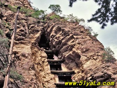 北洞是主體建筑部分。中區(qū)有大殿三間,座北向南。原為道教三清塑像,后被佛教改成三世佛。左右耳殿,另有東西配殿各三間,南閣一間。東側(cè)迎面山壁上,自然形成龐大的三角形石縫,內(nèi)有天然石洞,景觀奇特。石縫上端,外建五層樓閣。依崖開鑿卯洞,梁架結(jié)構(gòu)與崖石交接構(gòu)筑,建造精巧。閣內(nèi)設(shè)有鐵索,扶鐵索可攀援而上。在閣的東邊又有一洞,內(nèi)建殿三間,名九仙女閣,塑九仙女像。箭閣外塑趙杲泥像,頭頂距石崖僅二指半,故舊稱“趙杲觀,離天二指半”。再往南,就是趙杲觀最險(xiǎn)峻的景觀了。峭峰高處,半山腰中,山洞前面,建樓三間。一眼望去,高閣懸空,上峭崖,下絕壁,左右山石如刀削。上下左右根本無路可通。山洞中垂下一條長(zhǎng)約20米的鐵索,成了進(jìn)洞的唯一途徑。只有勇敢的虔誠(chéng)者或探險(xiǎn)者,方可垂直攀索而登,一般人只能望樓興嘆,故鐵索被譽(yù)為“仙閣云梯”。三層樓建筑后依山洞,前為磚木結(jié)構(gòu)。上層內(nèi)塑太上老君、無始天尊、通天教主。中層內(nèi)塑關(guān)圣帝君。下層供修持者居住。當(dāng)時(shí)修筑情景,真令人難以想像。北洞群落,地形險(xiǎn)要,峰巒競(jìng)秀,古木參天,峭峻幽邃,設(shè)計(jì)大膽,造型奇特。人夸“雁北懸空寺,不及代州趙杲現(xiàn)”說的并不過分。