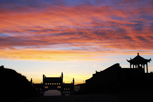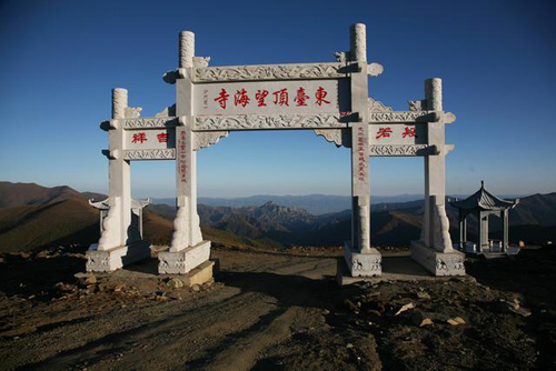 望海峰的盛景在于東觀日出。由于東面再無大山阻擋,所以人的目力可東眺非常遙遠(yuǎn)的地方。峰頂曾建有望海樓,專門為觀景而建。可惜年久已毀,1985年重建,為望海寺,內(nèi)供聰明文殊。有史籍記載日出之壯麗景象:“每當(dāng)蒸云寢壑之隙,爽氣澄秋之際,于日出扶桑之時(shí),可望紅日十倍于車輪,紅輪之下,隱隱水光閃爍,若波若鏡,瑰麗非凡。1977年8月,趙樸初先生登東臺(tái)觀日出后乘興填詞《五臺(tái)雜詠·調(diào)寄憶江南》,形象描繪了東臺(tái)日出之勝景: