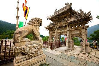 影壁中間鑲嵌有一石雕刻,文殊騎獅居中,人物花卉滿布四周,構(gòu)圖嚴謹,神情逼真。向北登108級臺階即達山門,門前漢白玉石獅一對,勾欄小拱橋一座,石牌坊一座,旗桿高聳于兩側(cè),雕工均佳。其中石牌坊最引人神往,從基石,抱柱,斜戧,額枋,斗拱到瓦頂,脊獸,無一不是精雕細刻,人獸,花卉,流云,山水等分布殿內(nèi),玲瓏剔透,它共有三門六柱,呈“一”字形,整體雄偉壯觀,巧奪天工,據(jù)說是由工匠耗時六年才建成。牌坊上刻有89條蛟龍,鱗爪俱現(xiàn),神態(tài)逼真;人物表情栩栩如生。游人觀后,無不交口稱贊,印象深刻。寺內(nèi)三座院落橫向排列,相互串通,又各有山門,自成風(fēng)格。東院為殿院,依地勢分前后兩進,除山門外,中線上還有佛殿兩座,圍枝廂房配殿,塑像俱存,彩繪房和獻亭,曲廊環(huán)繞,雙塔高聳,其中普濟禪師塔雕尤為精致。距龍泉寺西北里許的山坡,有一座楊業(yè)的瘞骨塔,六角、三級,高約10米。傳說楊業(yè)死后,五郎將其尸骨葬此,并建塔紀念。宋太宗后來追封楊業(yè)為楊令公,故后人稱此塔為令公塔。