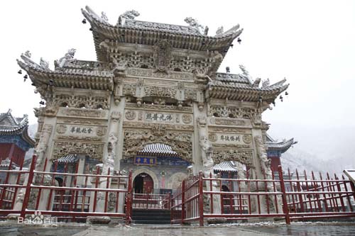 在五臺山的寺廟群中,有一座由家廟改成的佛教寺廟。這座寺廟山門前的石牌樓雕刻精美,很有名氣。它就是著名的龍泉寺,位于東溝北的山嶺下。