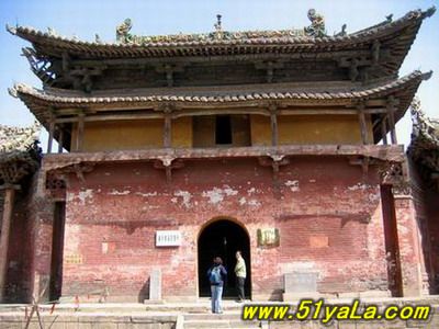 山門最古,為金時(shí)原構(gòu),五開間,兩層,下層磚砌高臺,中柱上裝青石門框及板門,門框上線刻花紋,圖案秀美。上層施平座及勾欄,粱架現(xiàn)整簡潔,結(jié)構(gòu)已具元代爬梁的雛形。屋頂琉璃為明代補(bǔ)制,鮮麗勁秀。這種高臺以上的門廡或殿宇,見宇敦煌壁畫,實(shí)物中少有。