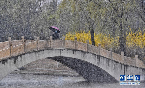 4月3日,市民在延慶區(qū)一個(gè)公園中賞雪。當(dāng)日,華北中部地區(qū)氣溫驟降,位于燕山山脈腳下的北京市延慶區(qū)降下一場(chǎng)春雪。 新華社記者 李欣 攝