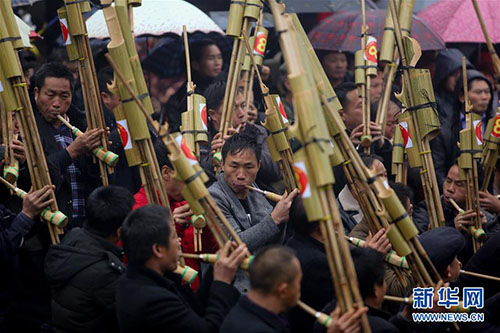 1月14日,人們?cè)趶V西融水苗族自治縣紅水鄉(xiāng)舉行的蘆笙節(jié)上賽蘆笙。 新華社記者 陳君清 攝
